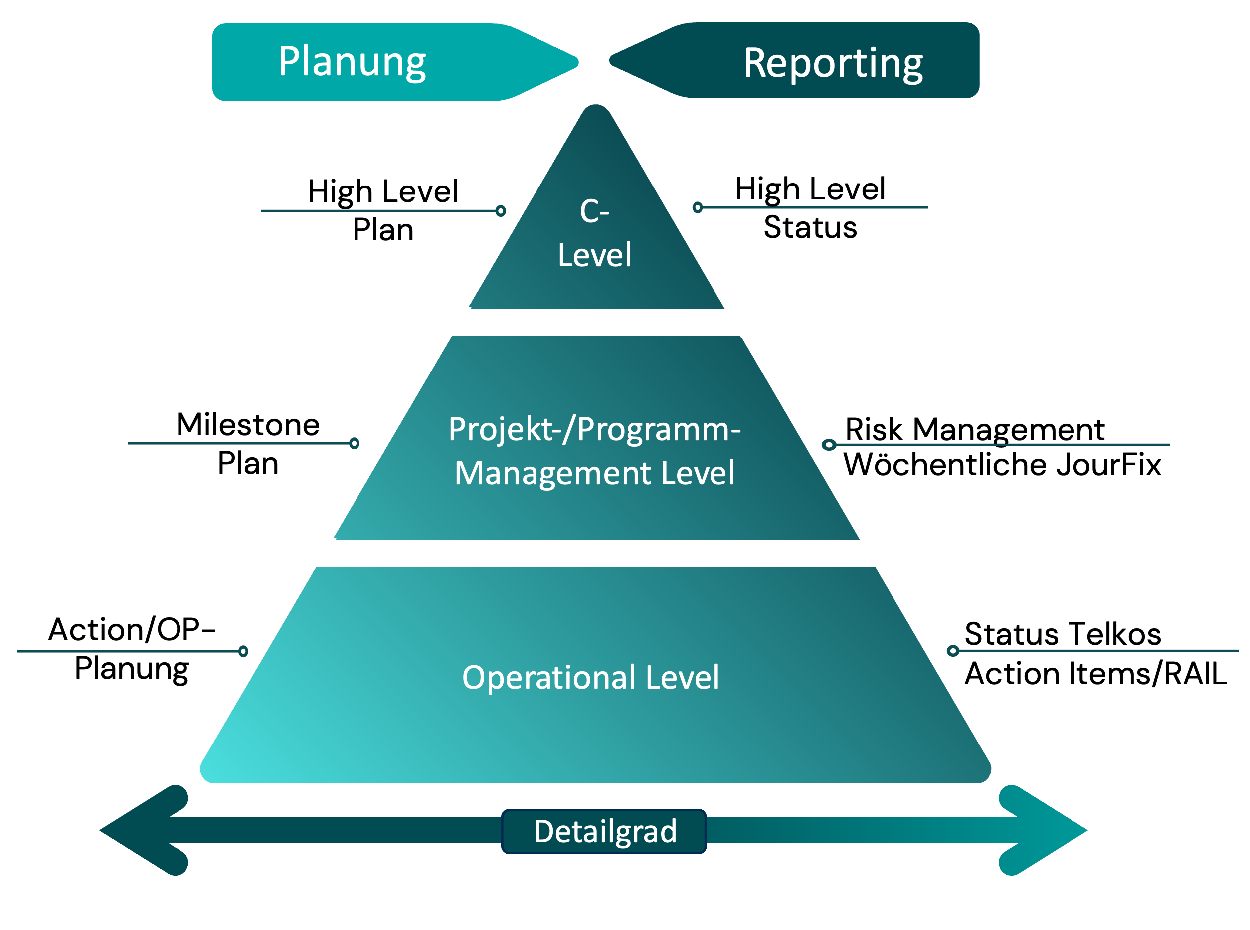 Das Modell basiert auf zwei Grundsäulen: Planung und Reporting. Die Planung sorgt für eine klare Struktur, indem relevante Ziele und Liefergegenstände definiert werden, während das Reporting eine transparente Kommunikation sicherstellt. Dabei wird bewusst auf unnötige Bürokratie verzichtet, um eine pragmatische und effiziente Umsetzung zu gewährleisten.